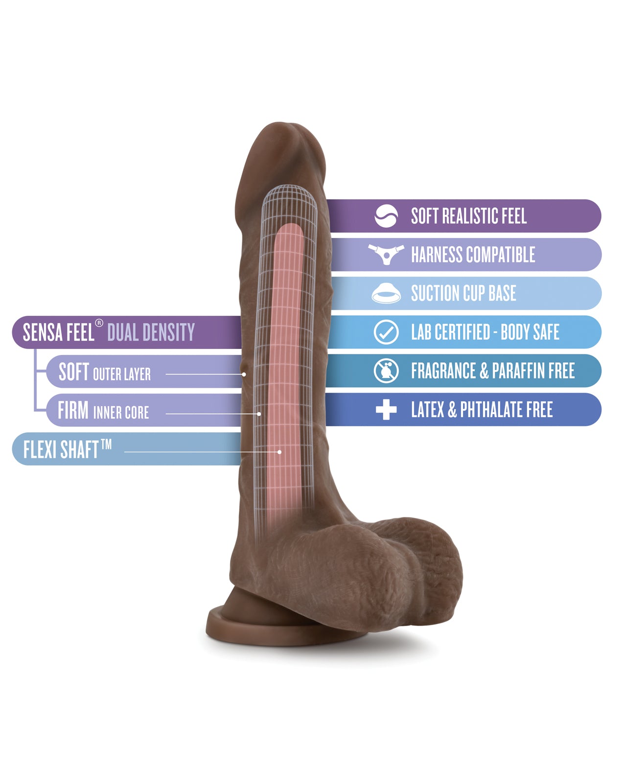 Meet Mister Perfect. He is sized just right. Utilizing our Sensa Feel Dual Density technology he feels real to the touch. Mister Perfect also features an integrated flexible spine adding to rigidity so you can ride him harder. Handcrafted with detail and quality in mind. Harness compatible. Pair him with our SX line of harness strap ons. He is flexible so he conforms to your body. Fragrance, latex and phthalate free. Hes.Mister Perfect! Our products are 3rd party tested for product safety. Our materials comply with international safety requirements.