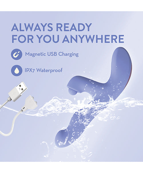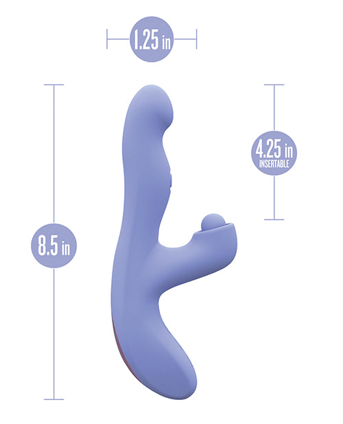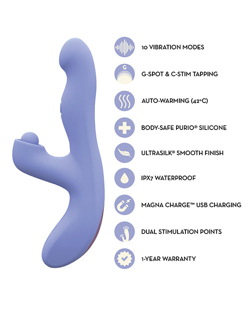 Meet Simone, your passionate companion for intimate exploration. Powered by Blushs RumboTech, this beautifully designed, dual-stim rabbit vibe combines 10 vibration modes with G-Spot and C-Stim tapping functions to deliver targeted sensations exactly where you crave them. Designed with a flexible shaft and sculpted external stimulator, Simone invites you to discover new heights of pleasure with effortless precision and passion. The auto-warming feature adds a layer of sensual heat, enhancing intimacy and heightening anticipation with every pulse. Crafted from 100% body-safe Puria silicone and wrapped in satin-smooth UltraSilk, Simone feels irresistibly soft and luxurious against your skin. With an IPX7 waterproof design, indulge in Simones pleasures during a relaxing bath or shower. Magna Charge USB charging ensures its always ready when you are. Bold yet intuitive, Simone is perfect for solo or partnered play, making every encounter unforgettable. Set your pace and get ready to lose control. One Year Warranty.