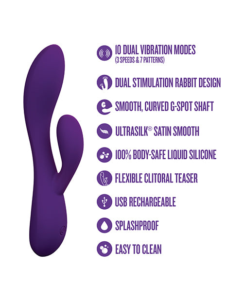 Lose yourself in the pleasure of Fever Dream. With 10 dual vibration modes, this playful rabbit surrounds you with sensation, offering G-spot thrills and clitoral ecstasy that build with every pulse. Its smooth, curved shaft delivers deep, satisfying pleasure, while the soft, flexible teaser moves with your body to heighten each touch and create breathtaking waves of stimulation. Made from 100% body-safe liquid silicone and wrapped in a satin-smooth UltraSilk finish, Fever Dream glides effortlessly across your skin for a luxurious feel. With splashproof versatility and USB rechargeability, its always ready when you arewhether for a quick escape, intimate exploration, or an all-night adventure. Step into the dream and let go. One Year Warranty.