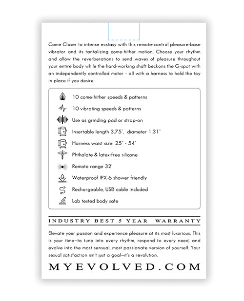 Come Closer to intense ecstasy with this remote-control pleasure-base vibrator and its tantalizing come-hither motion. Choose your rhythm and allow the reverberations to send waves of pleasure throughout your entire body while the hard-working shaft beckons the G-spot with an independently controlled motor all with a harness to hold the toy in place if you desire. Five Year Warranty.