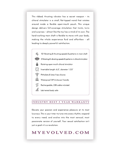 This ribbed, thrusting vibrator has a secret weapon its clitoral stimulator is a small, flat-tipped wand that rotates around inside a flexible open-mouth pouch. This unique design delivers full-coverage stimulation that twists, turns and surprises almost like the toy has a mind of its own. The hard-working main shaft is flexible to move with your body, making the whole experience fluid and effortless all leading to deeply powerful satisfaction. 5 year warranty.