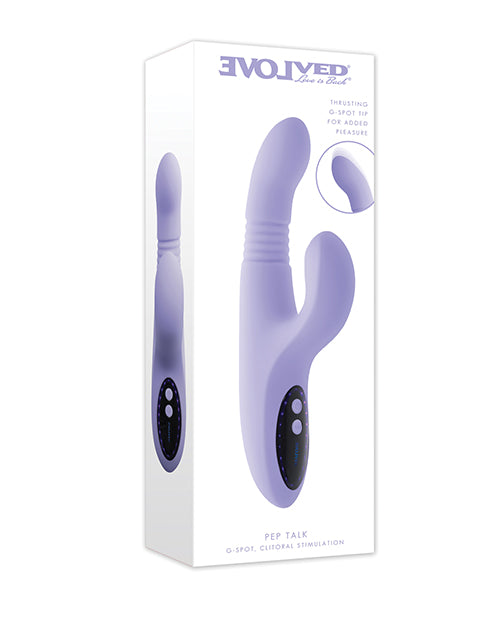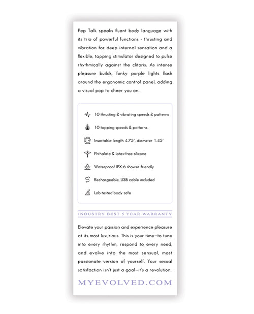 Pep Talk speaks fluent body language with its trio of powerful functions - thrusting and vibration for deep internal sensation and a flexible, tapping stimulator designed to pulse rhythmically against the clitoris. As intense pleasure builds, funky purple lights flash around the ergonomic control panel, adding a visual pop to cheer you on. Five Year Warranty
