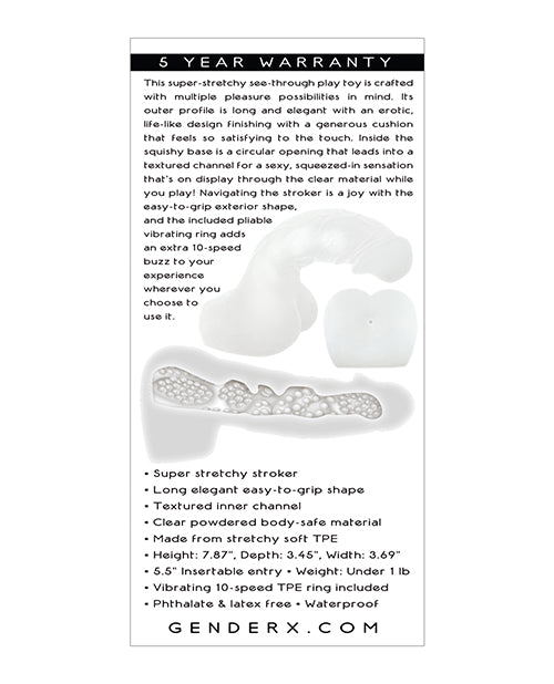 This super-stretchy see-through play toy is crafted with multiple pleasure possibilities in mind. Its outer profile is long and elegant with an erotic, life-like design finishing with a generous cushion that feels so satisfying to the touch. Inside the squishy base is a circular opening that leads into a textured channel for a sexy, squeezed-in sensation thats on display through the clear material while you play! Navigating the stroker is a joy with the easy-to-grip exterior shape, and the included pliable vibrating ring adds an extra 10-speed buzz to your experience wherever you choose to use it. Super stretchy stroker . Long elegant easy-to-grip shape . Textured inner channel . Clear powdered body-safe material . Made from stretchy soft TPE . Height: 7.87, Depth: 3.45, Width: 3.69 5.5 Insertable entry . Weight: Under 1 lb . Vibrating 10-speed TPE ring included . Phthalate & latex free . Waterproof. Five Year Warranty.