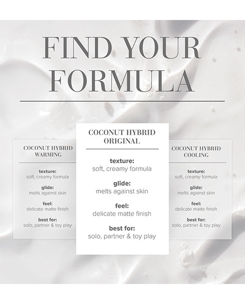 JO Coconut Hybrid lubricant is our unique blend of premium coconut oil and water-based ingredients. It offers a rich glide that melts against the skin for the perfect slide during solo, partnered, and toy play. Its soft, creamy formula absorbs naturally for a nourishing and delicate finish thats never greasy or oily. Key ingredients. Cocos Nucifera (Coconut) Oil is a natural antioxidant and moisturizer. Not compatible with polyurethane condoms.