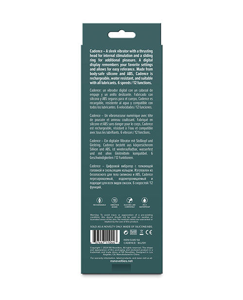 Cadence A sleek vibrator with a thrusting head for internal stimulation and a sliding ring for additional pleasure. A digital display remembers your favorite settings and allows for easy reference. Made from body-safe silicone and ABS, Cadence is rechargeable, water resistant, and suitable with all lubricants. 6 speeds / 12 functions.