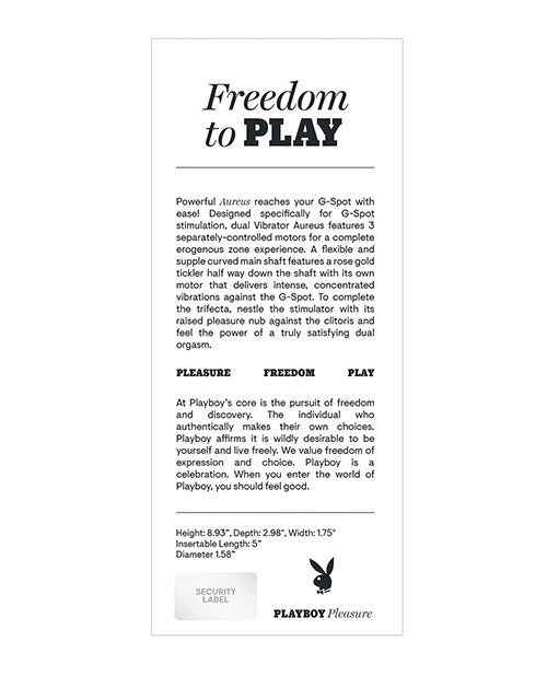 Powerful Aureus reaches your G-Spot with ease! Designed specifically for G-Spot stimulation, dual Vibrator Aureus features 3 separately-controlled motors for a complete erogenous zone experience. A flexible and supple curved main shaft features a rose gold tickler half way down the shaft with its own motor that delivers intense, concentrated vibrations against the G-Spot. To complete the trifecta, nestle the stimulator with its raised pleasure nub against the clitoris and feel the power of a truly satisfying dual orgasm. Five Year Warranty.