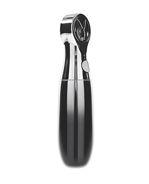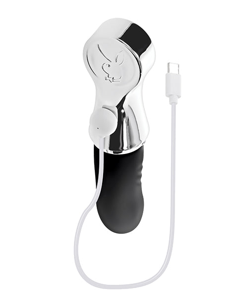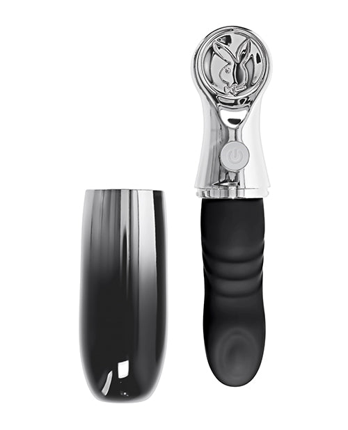 Bon Voyage! Weve got your travel adventures covered with this powerful tapping toy you can pop into any purse, bag or carry-on luggage for pleasure on the go! The chunky shaft is ribbed for extra sensation and comes to a head with 7 speeds and rhythms of tapping in the beautifully angled tip. With its ombre chrome carrier that twists into place right underneath the ergonomic Playboy rabbit head, your toy is fully protected until you pull it out for play time whenever you like. Heading to the hot tub? Bon Voyage can join your water games as its completely submersible! Five Year Warranty.
