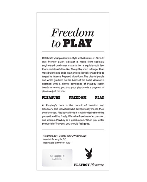 Celebrate your pleasure in style with Bunnies on Parade! This friendly Bullet Vibrator is made from specially engineered dual-layer material for a squishy-soft feel thats deliciously life-like. The girthy shaft is longer than most bullets and ends in an angled lipstick-shaped tip to target its intense 7-speed vibrations. The purple and white gradient on the body of the bullet vibrator is adorned with a playful cavalcade of Playboy rabbit heads to remind you that your playtime is a pageant of pleasure just for you! Five Year Warranty.