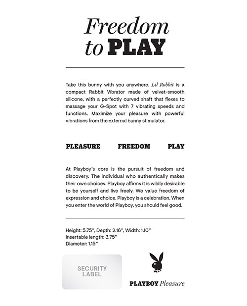 Take this bunny with you anywhere. Lil Rabbit is a compact Rabbit Vibrator made of velvet-smooth silicone, with a perfectly curved shaft that flexes to massage your G-Spot with 7 vibrating speeds and functions. Maximize your pleasure with powerful vibrations from the external bunny stimulator.