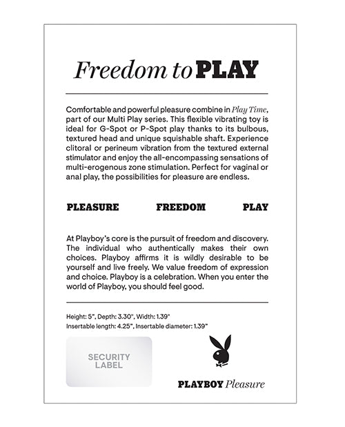 Comfortable and powerful pleasure combine in Play Time, part of our Multi Play series. This flexible vibrating toy is ideal for G-Spot or P-Spot play thanks to its bulbous, textured head and unique squishable shaft. Experience clitoral or perineum vibration from the textured external stimulator and enjoy the all-encompassing sensations of multi-erogenous zone stimulation. Perfect for vaginal or anal play, the possibilities for pleasure are endless.