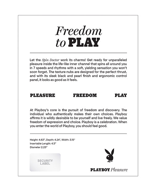 Let the Spin Doctor work its charms! Get ready for unparalleled pleasure inside the life-like inner channel that spins all around you in 7 speeds and rhythms with a soft, yielding sensation you wont soon forget. The texture nubs are designed for the perfect thrust, and with its sleek black and pearl finish and ergonomic control panel, it looks as good as it feels. Five Year Warranty.