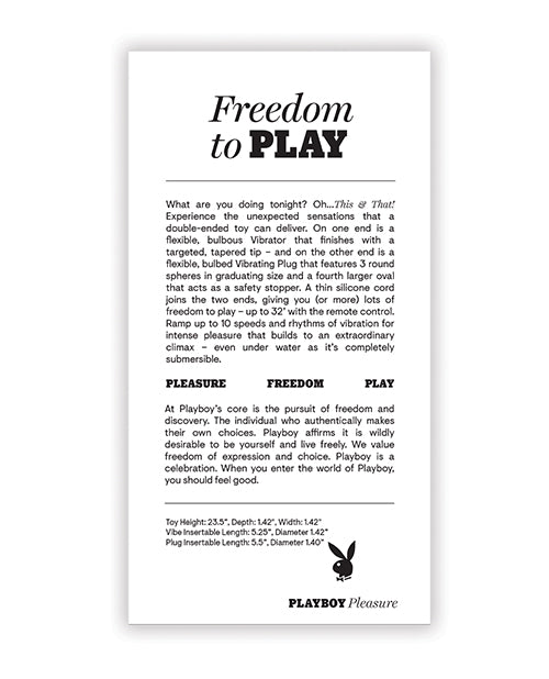Freedom to Play What are you doing tonight? OhThis & That! Experience the unexpected sensations that a double-ended toy can deliver. On one end is a flexible, bulbous Vibrator that finishes with a targeted, tapered tip and on the other end is a flexible, bulbed Vibrating Plug that features 3 round spheres in graduating size and a fourth larger oval that acts as a safety stopper. A thin silicone cord joins the two ends, giving you (or more) lots of freedom to play up to 32 with the remote control. Ramp up to 10 speeds and rhythms of vibration for intense pleasure that builds to an extraordinary climax even under water as its completely submersible. Five Year Warranty.