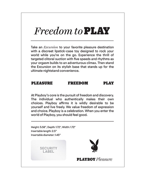 Take an Excursion to your favorite pleasure destination with a discreet lipstick-case toy designed to rock your world while youre on the go. Experience the thrill of targeted clitoral suction with five speeds and rhythms as your orgasm builds to an adventurous climax. Then stand the Excursion on its stylish base stands up for the ultimate nightstand convenience.