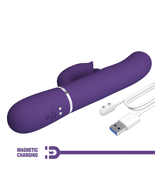 Designed for maximum pleasure, stay in bed with the Pretty Love Rabbit Vibrator. The vibrator is with 7 thumping settings on both points in the shaft and 7 licking setting in the clitoris stimulator! All these functions can work together to delight two hot spots at once! Sink on to smooth stimulation with silicone coating for a fully waterproof experience so you can get hot and bothered in and out of the bedroom. Plus, it's always ready to go with magnetic USB charging. For enhanced pleasure, press the Burst Climax Button to explore your incredible and earth-shattering orgasms. One Year Manufacturer Warranty.