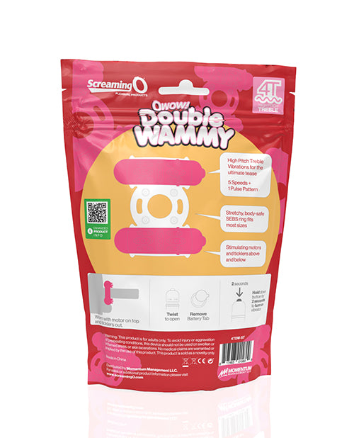 Screaming O 4T Double Wammy. High Pitch Treble Vibrations with 5 speeds + 1 pulse pattern. Stretchy, body-safe SEBS ring fits most sizes. Stimulating motors and ticklers above and below. Reusable. Waterproof.
