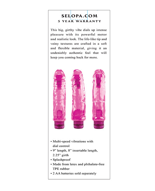 This big, girthy vibe dials up intense pleasure with its powerful motor and realistic look. The life-like tip and veiny textures are crafted in soft and flexible material, giving it an undeniably authentic feel that will keep you coming back for more. Multi-speed vibrations with dial control. 9 length, 8 insertable length, 2.25 girth. Waterproof & submersible. Made from latex and phthalate free TPE rubber. 2 AA batteries sold separately. Five Year Warranty.