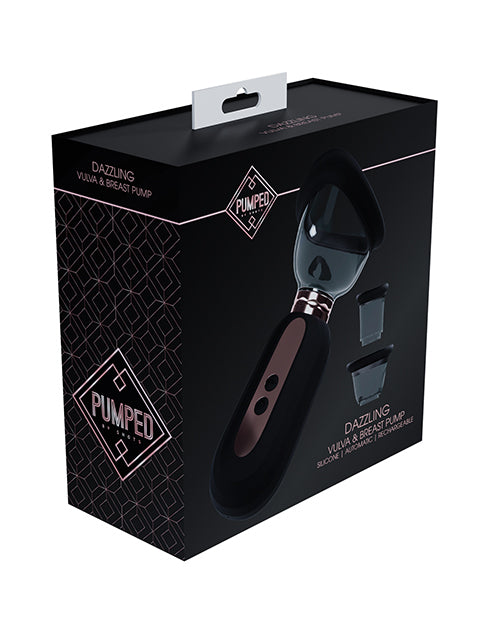 Pump to plump and ensure your sensitive areas are looking their best with the Pumped ArousingVulva & Breast pump by Shots. This high quality pump uses quick and efficient vacuum suction to help firm up and increase the size of your breasts and vulva, along with their sensitivity, making this the perfect accessory for pre-bedroom preparation. The cups are designed with a silky smooth, comfortable silicone seal, that prevents air or moisture from entering. To use, simply place the cup over the desired area, activate the function buttons, and let the sensations whisk you away. Works with all different breast sizes. Use it no longer then 20 -30 minutes for both breasts and/or vulva, and only pump to a comfortable feel. This kit contains 1 vulva cup, 1 breast cup, 1 clitoral cup and a F1-motor powerful pump.