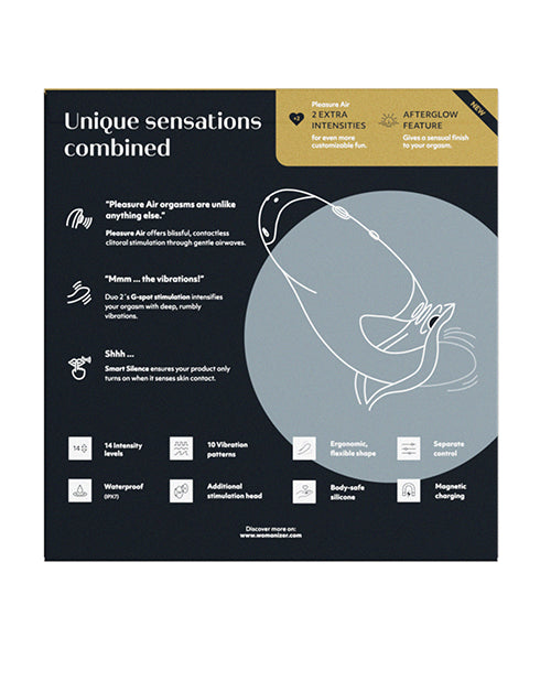 DUO 2 is a unique premium rabbit toy a Pleasure Air clitoral stimulator and powerful G-Spot vibrator combined to create advanced, blended orgasms. Pleasure Air surrounds the clitoris with pulsating waves and gentle suction leading to a new kind of extraordinary orgasm. Dual Stimulation - DUO 2 simultaneously targets the G-spot with deep rumbly vibrations and the clitoris with suction-like Pleasure Air stimulation, creating satisfying blended orgasms. The flexible inner arm is curved upwards to target the G-spot with gentle vibrations. DUO 2 is waterproof (IPX7), making it easy to clean and enjoy anywhere outside of the bedroom. Find your rhythm with 10 different vibration patterns from the wave to the cha-cha or just pure steady vibrations. 14-Intensity Levels - Now with an additional two intensity levels, DUO 2 can offer the right setting for every mood. Afterglow - By briefly pressing the power button, DUO 2 will quickly revert to a lower setting for a relaxing end to an orgasm. Smart Silence - DUO 2 automatically turns off when not in contact with skin.