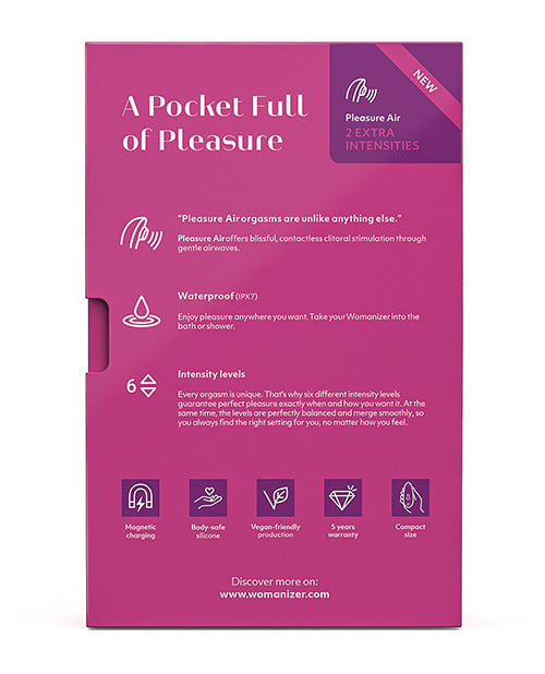 Compact sized clitoral stimulator for people seeking the unique sensations of Pleasure Air Technology. The new Womanizer STARLET 3 its the original Womanizer Pleasure Air Technology combined with five new vivid product colors and two more intensity levels, while its still waterproof and USB rechargeable for a reasonable price. 6 intensity levels - Every orgasm is unique. That's why six different intensity levels guarantee perfect pleasure exactly when and how you want it. The intensity levels are perfectly balanced and offer the right setting for your every mood. Body fit - The sensual, slim design fits comfortably in your hand and becomes the perfect companion for even the most intimate moments.IPX7 Waterproof - You want to dive deeper? Since your WOMANIZER is IPX7 waterproof, nothing stands in the way of a long, relaxing bath, a refreshing shower or even a pool party. Materials : ABS plastic made without phthalates, BPA or latex. Dimensions : 117mm x 46mm x 47mm USB rechargeable - Run Time : 30 min Charge Time : 30 min Five Year Warranty.