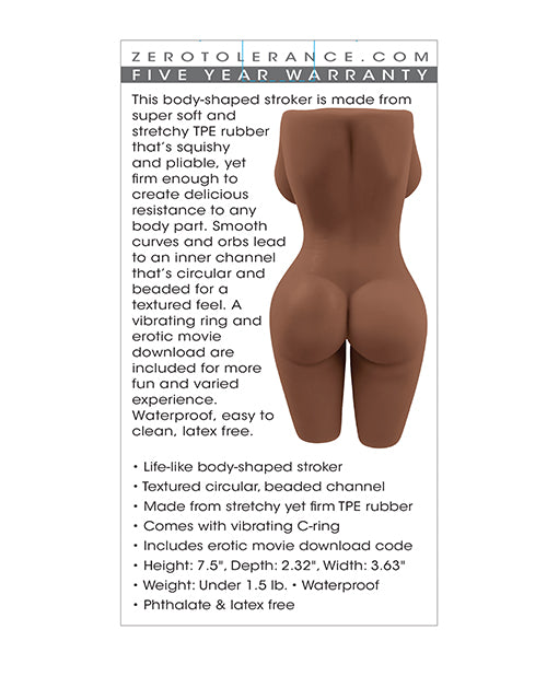 This body-shaped stroker is made from super soft and stretchy TPE rubber thats squishy and pliable, yet firm enough to create delicious resistance to any body part. Smooth curves and orbs lead to an inner channel thats circular and beaded for a textured feel. A vibrating ring and erotic movie download are included for more fun and varied experience. Waterproof, easy to clean, latex free. Five Year Warranty.