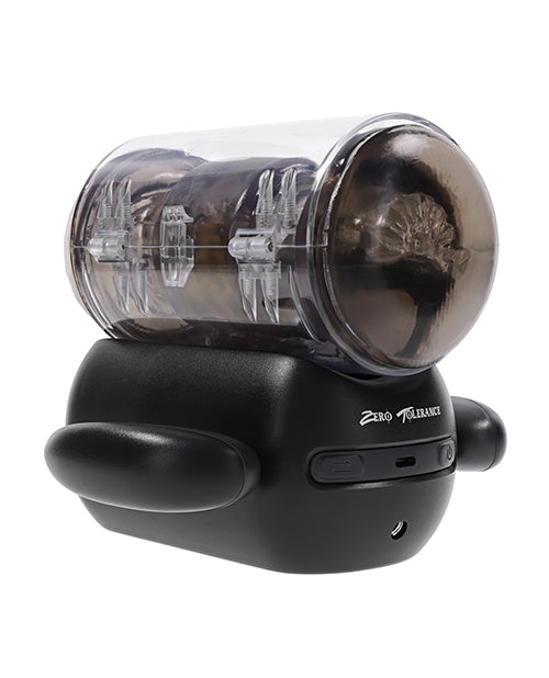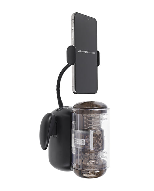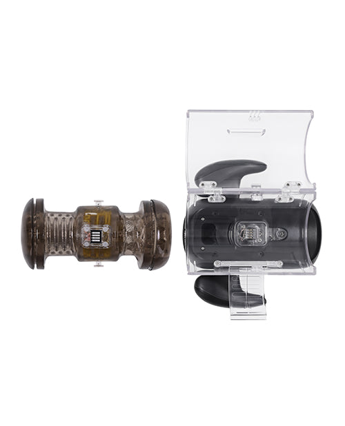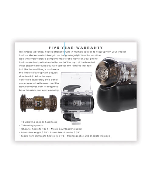 This unique vibrating, heated stroker thrusts in multiple speeds to keep up with your wildest fantasy. Get a comfortable grip on the gaming-style handles on either side while you watch a complimentary erotic movie on your phone that conveniently attaches to the end of the toy. Let the beaded inner channel surround you with soft yet firm textures that feel just like the real thing and warm the whole sleeve up with a quick double-click. All motors are controlled separately by a panel you can reach with ease, and the sleeve removes from its magnetic base for quick and easy cleaning. Five Year Warranty.