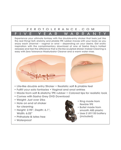 Experience your ultimate fantasy with the double-entry stroker that feels just like the real thing! Soft, stretchy and pliable TPE rubber moves with your body as you enjoy each channel vaginal or anal depending on your desire. Get erotic inspiration with the complimentary download of one of Sasha Greys hottest releases and feel the difference that a life-like sculpted stroker makes! Cleaning is easy with ZT Masturbator Cleaner and a warm water rinse.