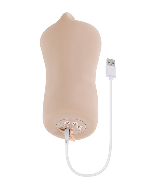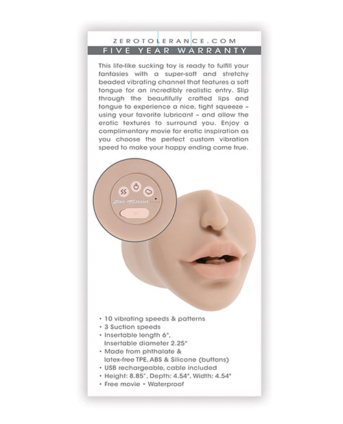 This life-like sucking toy is ready to fulfill your fantasies with a super-soft and stretchy beaded vibrating channel that features a soft tongue for an incredibly realistic entry. Slip through the beautifully crafted lips and tongue to experience a nice, tight squeeze using your favorite lubricant and allow the erotic textures to surround you. Enjoy a complimentary movie for erotic inspiration as you choose the perfect custom vibration speed to make your happy ending come true. Five Year Warranty.